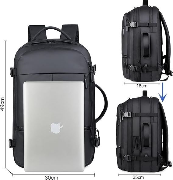 Rucsac de călătorie extensibil cu port USB - negru, potrivit pentru laptopuri de până la 15,6", bagaj de cabină.