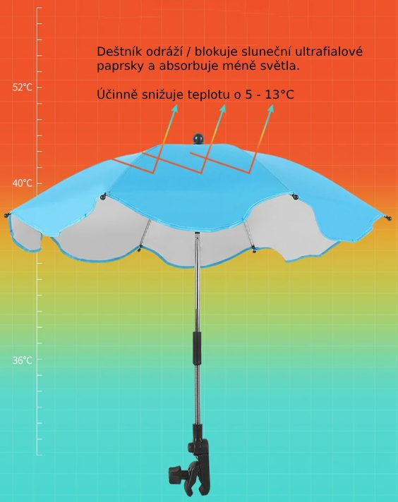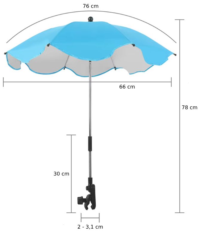Umbrela este proiectată cu dimensiuni compacte, astfel încât să fie ușor de transportat, și oferă suficientă umbră. Este ideală pentru utilizarea pe plajă sau când este prinsă pe cărucior.