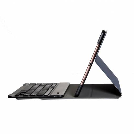 Tastatura bluetooth este parte dintr-o carcasă rezistentă, care protejează tableta Apple de zgârieturi și în caz de căderi. Tastatura are un buton pentru blocare/ deblocare rapidă a dispozitivului, iar încărcarea se face prin cablu micro USB, ce este inclus în ambalaj.