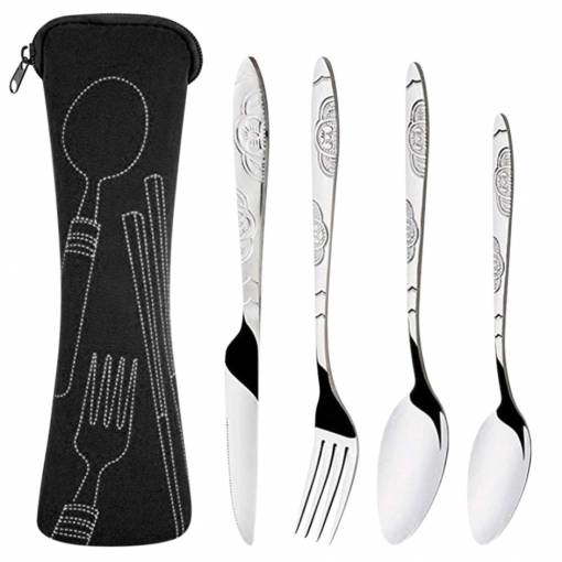 O husă stilată pentru ustensile din neopren, care este ușor de spălat, astfel încât să o poți folosi continuu. În husă se potrivește un cuțit, o furculiță, o lingură și o linguriță mică, se poate folosi și ca un ambalaj pentru periuța de dinți și pastă.