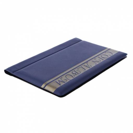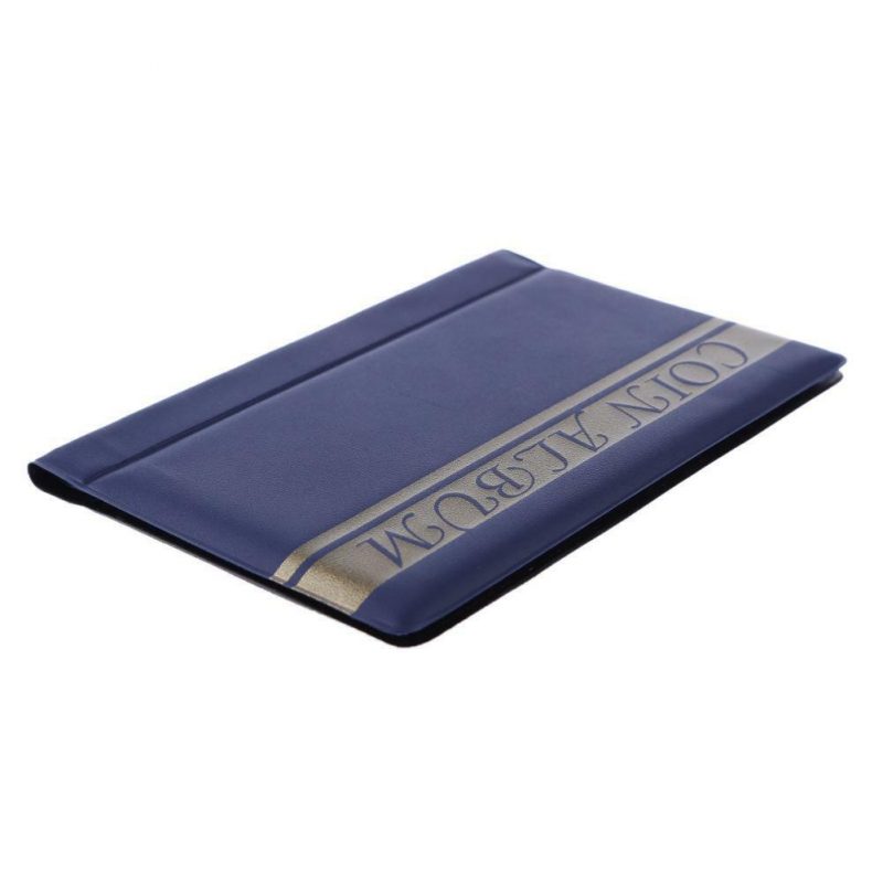 Albumul pentru monede este fabricat dintr-o imitație de piele de calitate, realizat în culorile albastru și auriu, marginile albumului fiind rotunjite, nu există riscul de rănire.